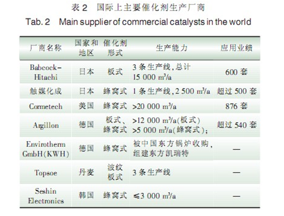 SCR 工艺自1978 年在日本成功地实现工业应用以后,工艺技术与催化剂的生产技术一直在不断地进步与完善,形成了由触媒化成与界化学为代表的蜂窝式和以 Babcock-Hitachi 为代表的板式2 种主流结构与技术。在本国的生产能力并没有太多扩大可是技术已经向美国、欧洲及亚洲的韩国、中国台湾省及中国内地输出。目前各主要生产商生产的 SCR催化剂及产量如表 2 所示。