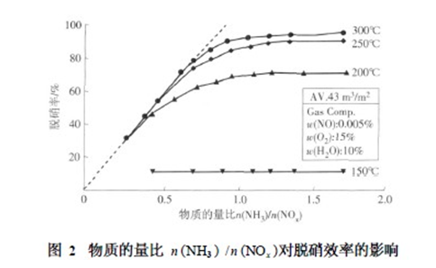 物质的量比n (NH3 ) / n (NOx )对脱硝效率的影响如图2所示(由厂家提供) 。