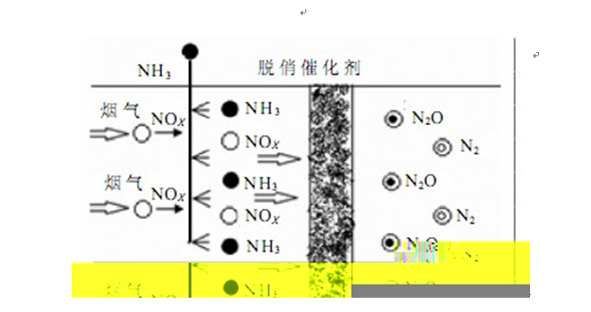 在催化剂作用下,向温度约280~420℃的烟气中喷入氨,将NO和NO2还原成N2和H2O。化学反应方程式如下: